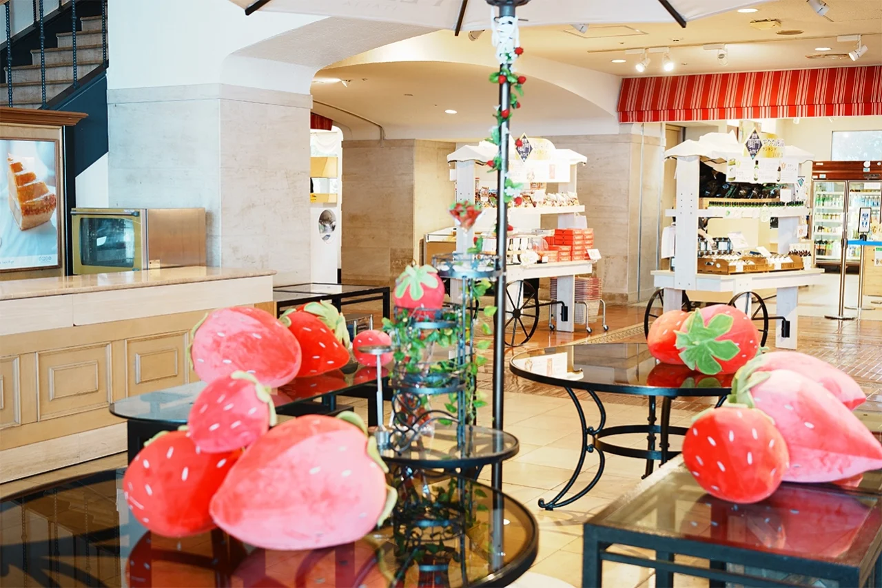 ケーキのショーケースもいちごのディスプレイがあって可愛い