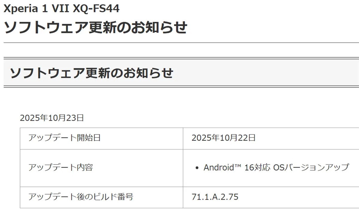 本日10月22日(水)、SIMフリー版Xperia 1 Ⅶ、Android 16 アップデートが開始された。