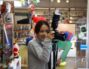 取材に来た、カメラマン兼ライターさんは、去年と同じ美人女性♪ なんだか、ごっつそうな機材を一人でセッティングし、リビングシアターコーナーをバシバシ撮影していた。↑はそのときの様子。ブログ用に、こっそり背後から、盗撮(?)してみたところ・・・