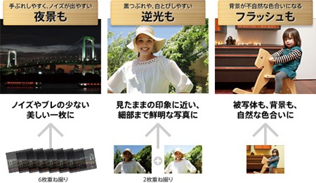 9パターンのシーンを自動認識し、自動複数撮影による重ね合わせ技術を駆使することで、だれもが簡単にキレイに撮影が可能になる。。。それが、「プレミアムおまかせオート」。