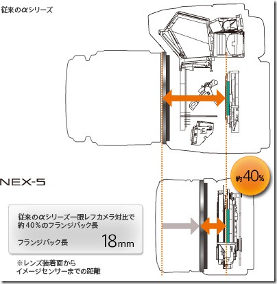 ミラーレスカメラとも言われるように、ミラーがなく、液晶画面のみ。ファインダーはない。そのため、レンズ装着面から、CMOSまでの距離=フランジバック長が極端に短く、サイバーショットみたいに薄い!(グリップ部はそれなりの厚さ)