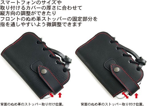 サイドの紐を調整することで、様々な長さのスマートフォンや厚めのハードケースをつけたスマートフォンにも対応可能。