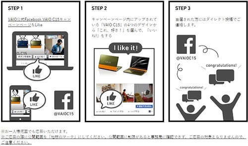 ↑応募方法は、VAIO公式FBをいいねして、、、アップされている、4つのカラーのVAIO C15の中から選んで、いいねする。