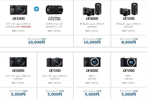 ↑α5100,α6000は、ボディ単体でもレンズキットでもキャシュバックされるが、α6300だけは、かなり条件が厳しい。その分、今回最大のキャッシュバック額の、20,000円となっている。