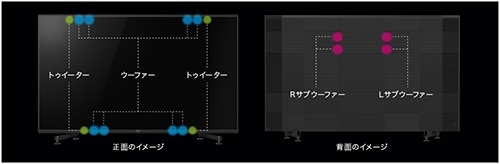 大画面の弱点、映像と音の位置の不一致は、画面上部と下部にスピーカーを配置することで克服。