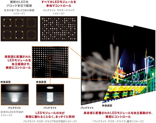 従来の「ブロック単位での駆動を行う、直下型LED部分駆動」とは違い、すべてのLEDが完全独立駆動する「バックライトマスタードライブ」搭載。さらに、あらゆる映像を8K映像に作りかえる「8K X-tended Dynaic Range PRO」、動きの速い映像を明るくくっきり映す「X-Motion Clarity」も搭載。