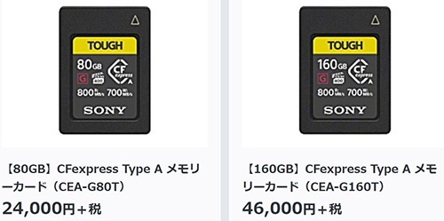 ↑おすすめ記録メディアとして、CF Type Aカードも掲載されているが、静止画メインの人には大容量すぎて、動画メインユーザー向けか。80GBモデルとリーダーライターを購入して、後日、速度測定などしてみようと思ってる。
