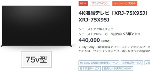My Sony IDでサインイン購入すれば、いつでも10%OFFだから、実質396,000円(税込)。ソニーカード or ソニー銀行カードでの決済で、さらに3%OFFの、384,120円。3年保証&標準設置サービスは無料。悪くないよね!