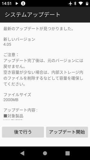 アップデートは、Music Center for PCか、本体をWiFi接続して行う。バッテリー残60%以上かつ充電状態で、空き容量2GB以上。