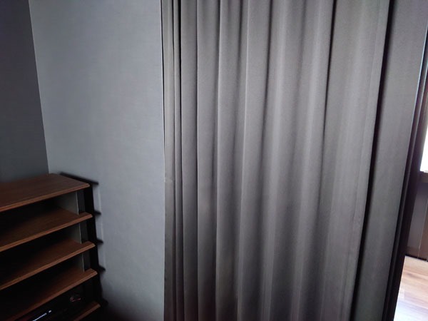 ↑左後方に、縦型のAVラックを配置し、機器類は全て収納。視界には、テレビとフロントスピーカー以外は入らない。映像に没入するのだ!そして、、、AVラック横には謎のカーテン。実はこの裏には、「シャワールーム」を完備!