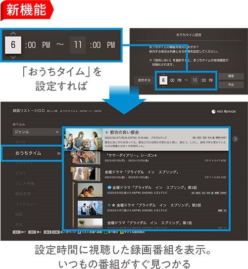 ↑録画リストの「ジャンル」に新たに「おうちタイム」の分類を追加。「おうちタイム」には設定した時間帯によく見る録画番組をまとめて表示。
