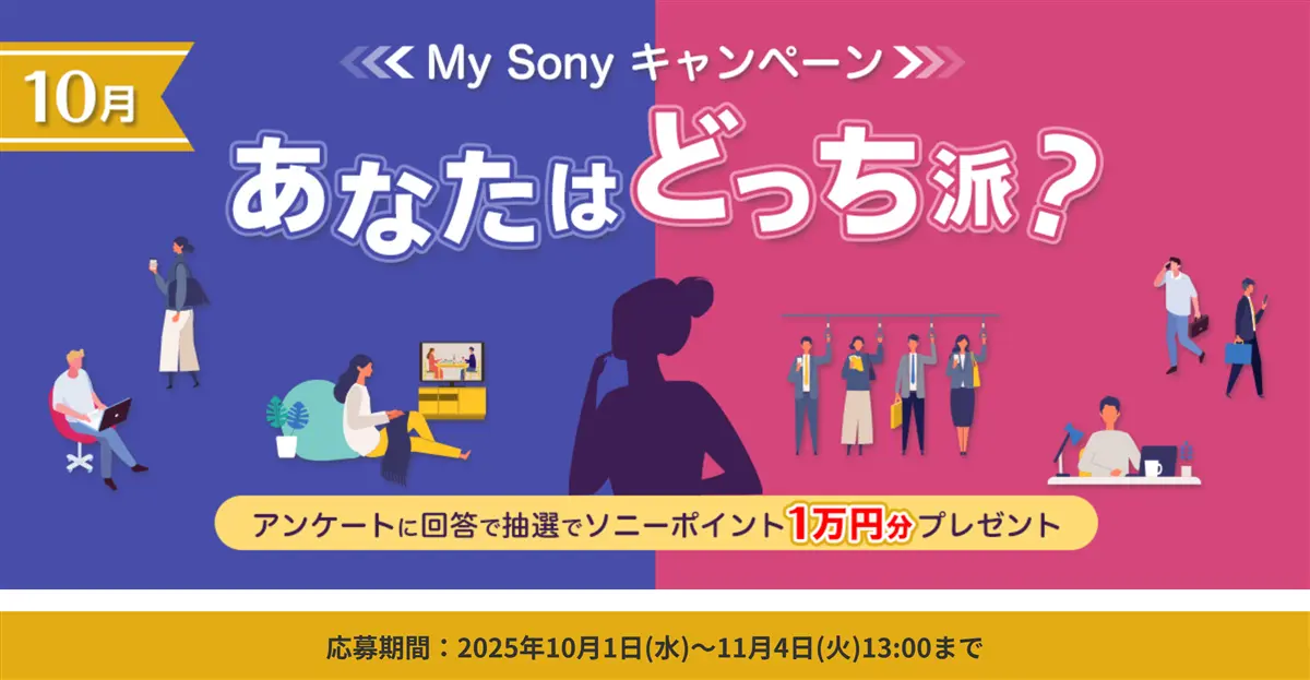 毎月恒例「My Sony キャンペーン あなたはどっち派?」2025年10月版 アンケートに答えて抽選で10名にソニーポイント1万円分が当たる!11月4日(火)まで