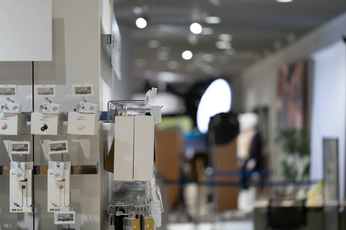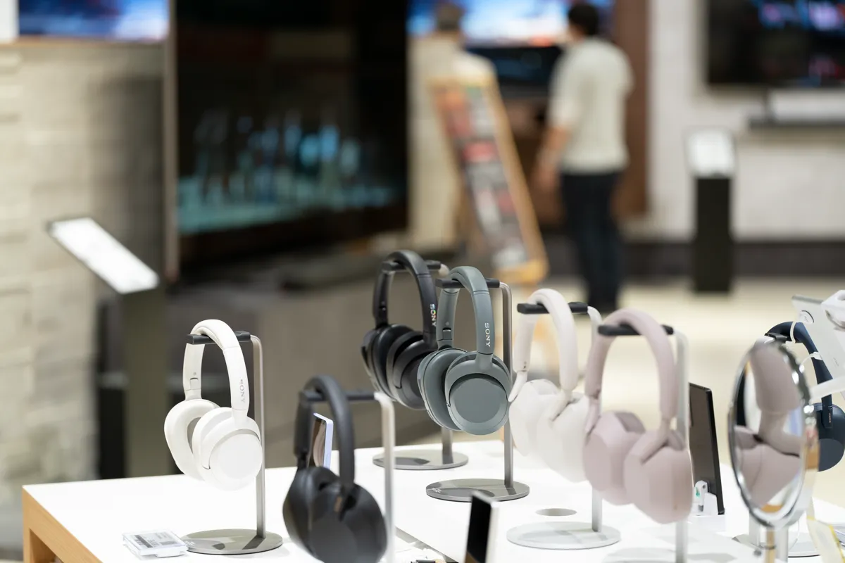 ↑自然な、ぼけ。被写体のヘッドホンたちが、際立っている。このカットでは、中心のグリーンのヘッドホンに合焦させているが、AFポイントを、各ヘッドホンに移動する度に、小気味よくスパスパと合焦する。