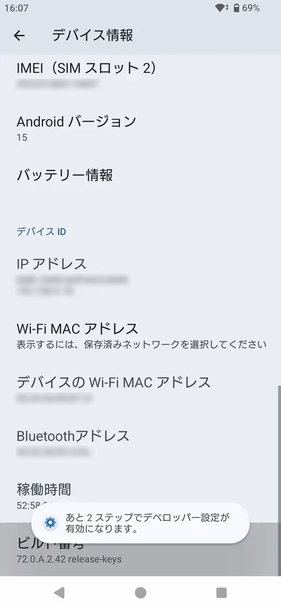 ↑設定→デバイス情報→ビルド番号を連打する。あと何回連打すればいいか表示され、、、さらに連打すると、「開発者向けオプションが有効になりました」と表示される。
