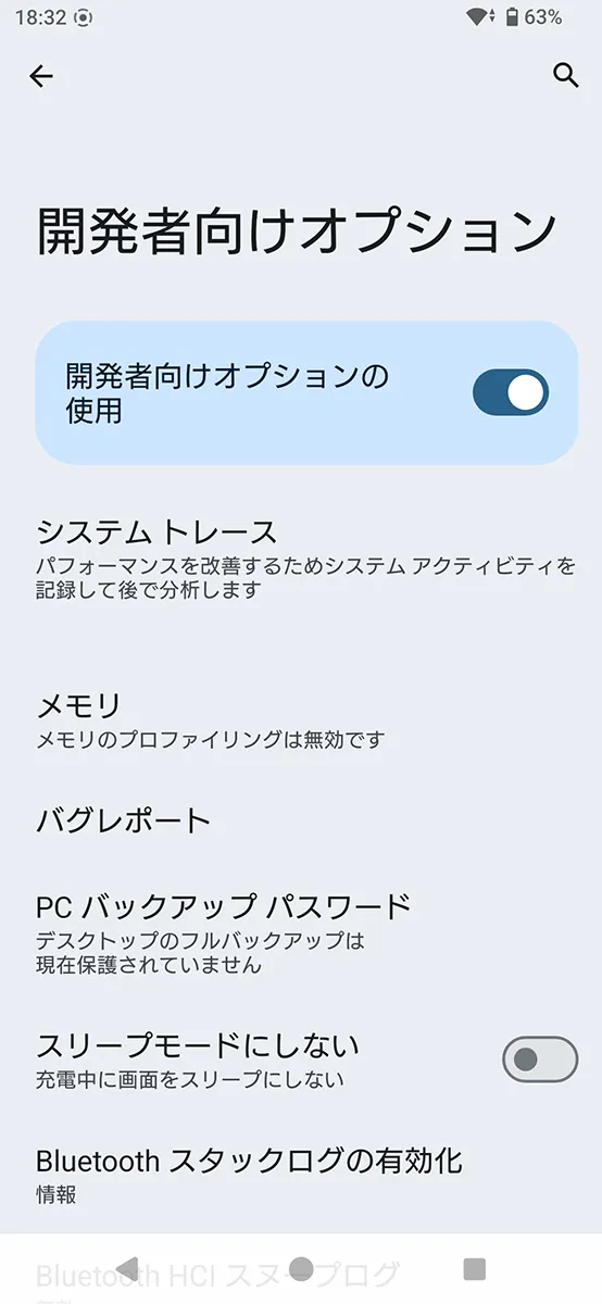 ↑これが、普段は表示されない、隠し設定とでも言えばいいか「開発者向けオプション」