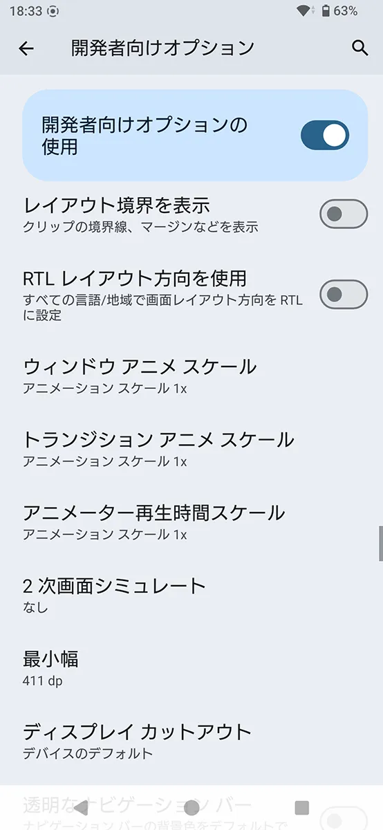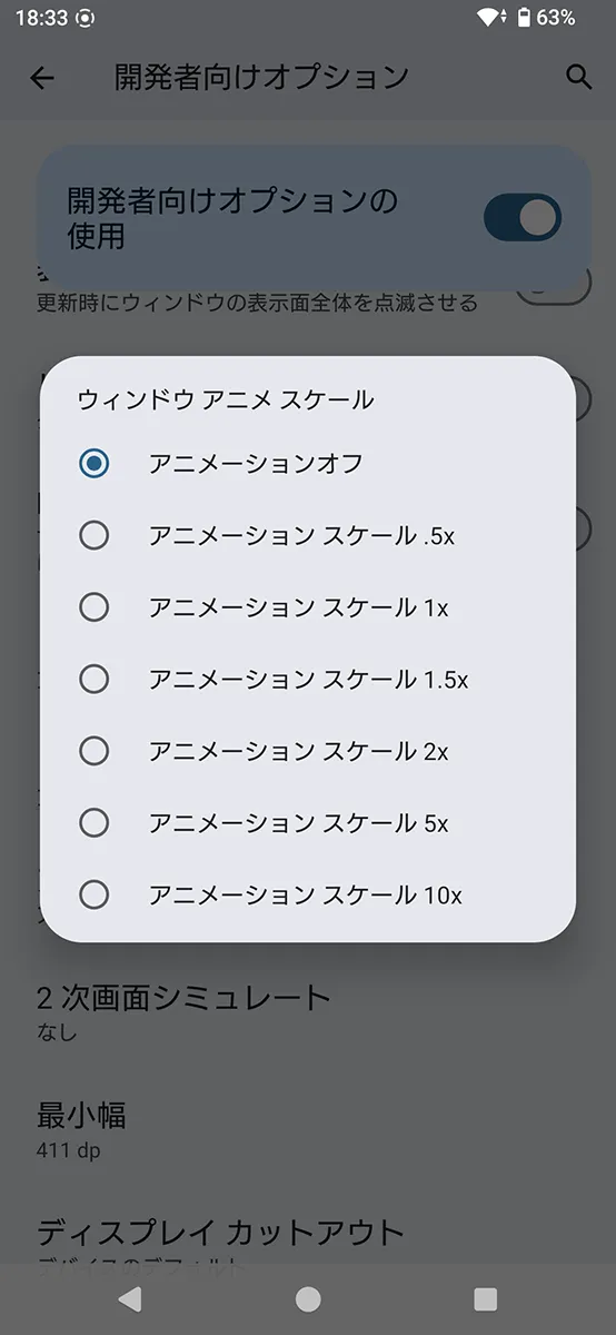 2.「開発者向けオプション」から、アニメーション関連設定3種をすべてOFFにする