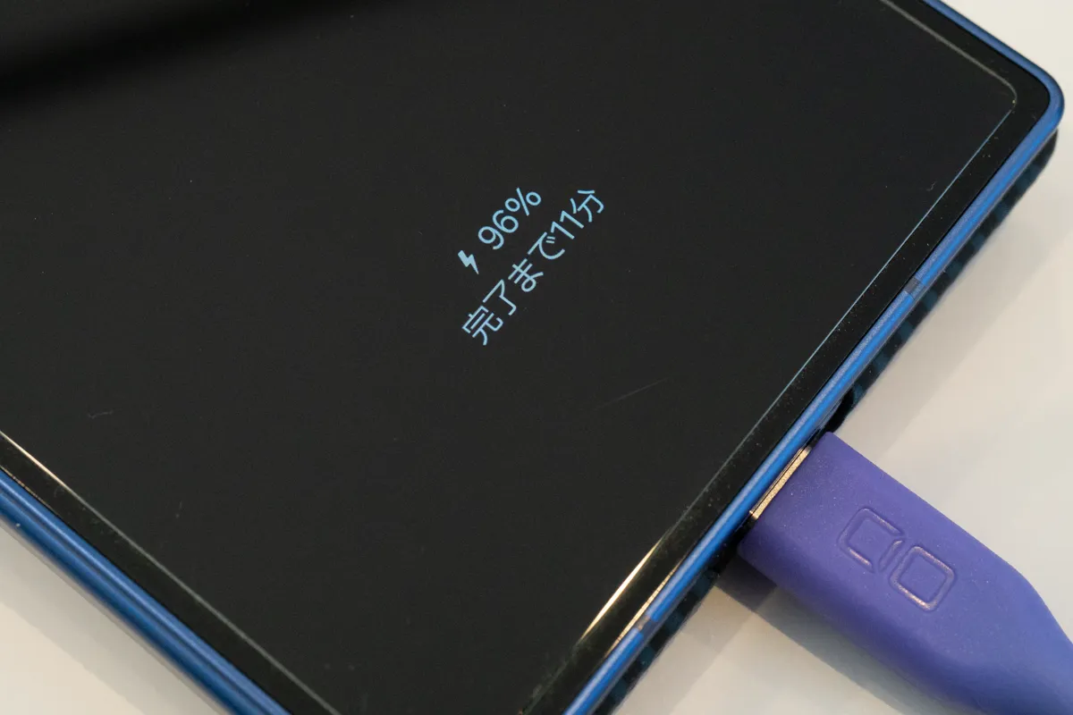 さて、そのFold7は、、、充電中は、↑画像のとおり、現在のバッテリー残量と、充電完了までの予測時間が、ディスプレイに「常時表示」される。充電完了すれば、表示は消える(表示しっぱなし設定は可能)