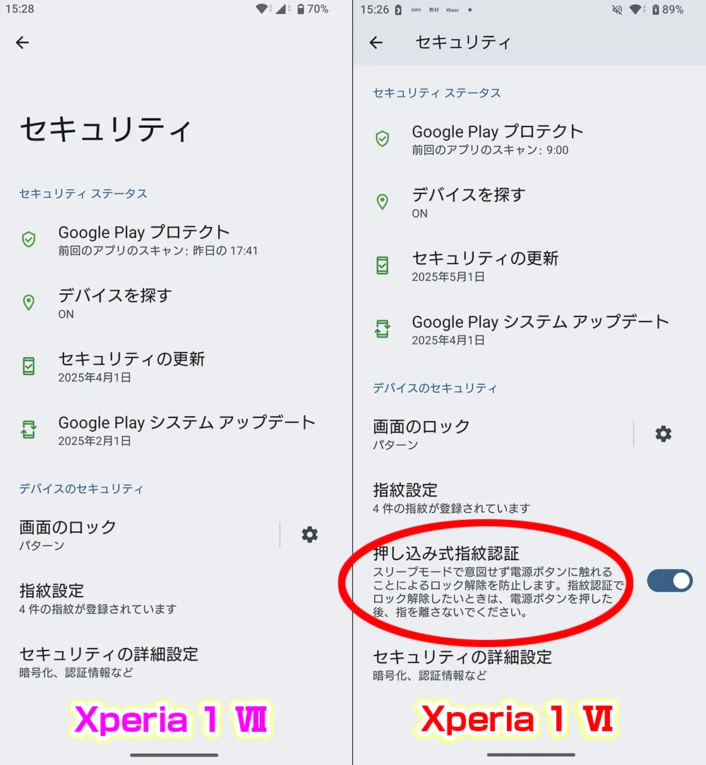 画面ロック解除時、指紋センサー内蔵電源ボタンに指を添えるだけでなく、ボタンごと押し込んではじめて反応するのが、「押し込み式指紋認証」機能だ。Xperia 1 Ⅵでは、設定内にこの項目があり、出荷時は確かOFFだったはず。ONにすれば、ありがたいこの機能が使用できるようになる。ONにしておけば、誤動作防止になるのだ。