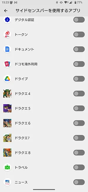 ↑ゲームアプリとか、動画アプリとか、、、サイドセンスが起動すると困るモノは案外多いはず。そういうときは、設定で、アプリごとにOFFし、サイドセンスを起動しないようにできる。
