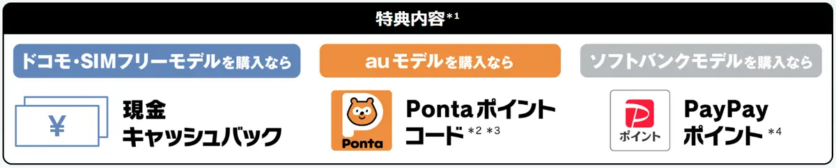 ※SIMフリー&ドコモモデルは現金、auはPONTAポイント、ソフトバンクモデルはPayPayポイント