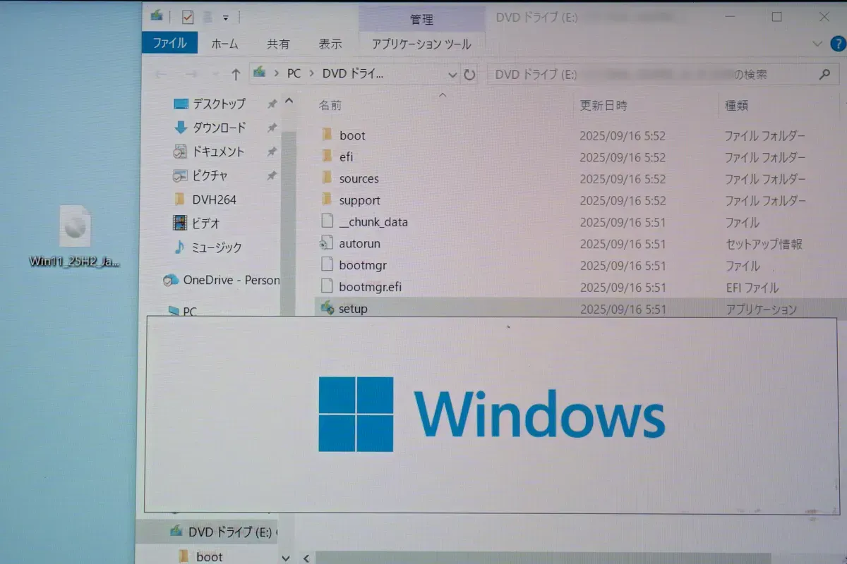 用意した最新のWindows11 インストール用ISOファイルを、Windows10 or Windows11 PCへコピー。右クリックして、マウント選択すれば、↑DVDドライブとして使えるようになる。Setupファイルを起動して、インストールを開始する。
