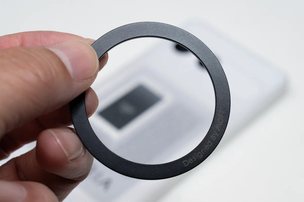 ↑用意した、MagSafe用リングは、0.5mm厚。磁力なしの、ただの、メタルリング(2枚で699円)。