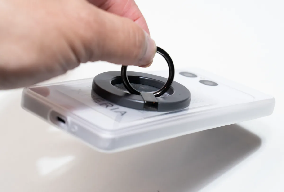↑磁力ありのマグネットリングだ。当ブログでは、お馴染みの、MOFTさんのやつ(1280円)。磁石が仕込まれてることもあって、1mm厚。磁力なしのなんと、2倍もの厚み。さて、こんな分厚いのでも、はさめるのだろうか、純正カバーは。