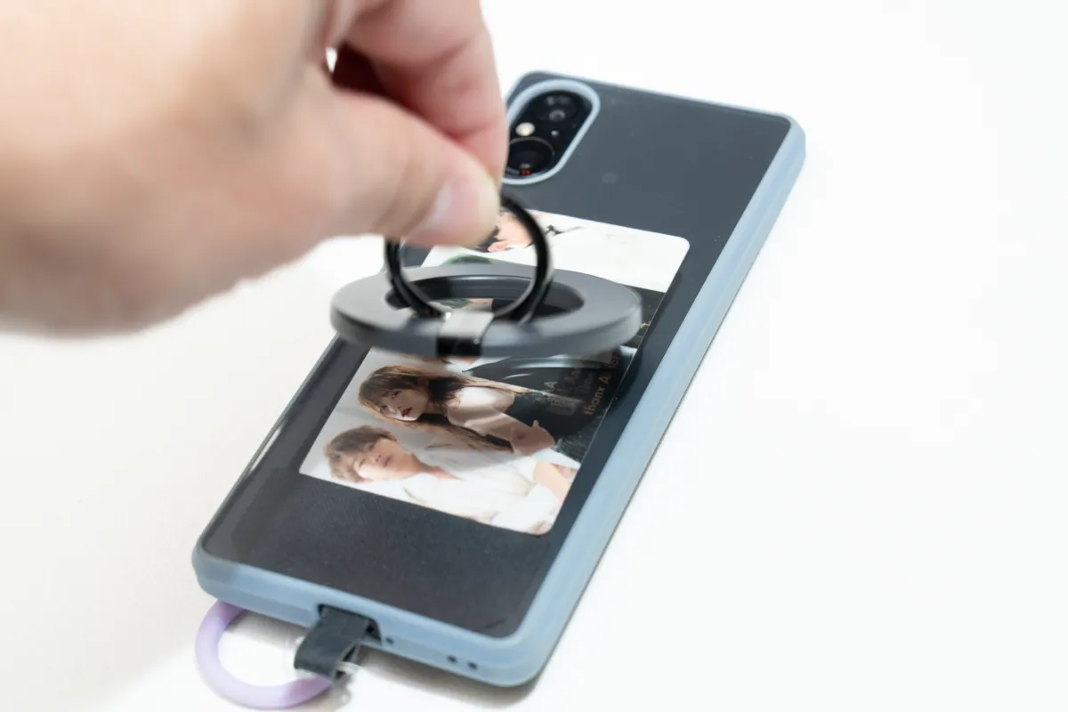 ところが、、、MagSafe対応ケースの最大の弱点は、、、↑そのリングが、はさんだステッカーなどにかぶってしまうこと。これじゃぁ、推しに失礼ってもんだ。