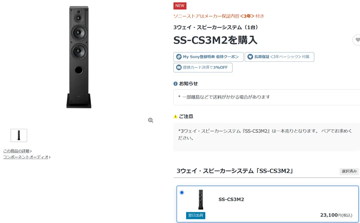すでに、ソニー公式サイトでも、わざわざ「生産完了品を見る」からたどらないといけない位置に表示されている、ハイコスパな、トールボーイスピーカー「SS-CS3」だ。