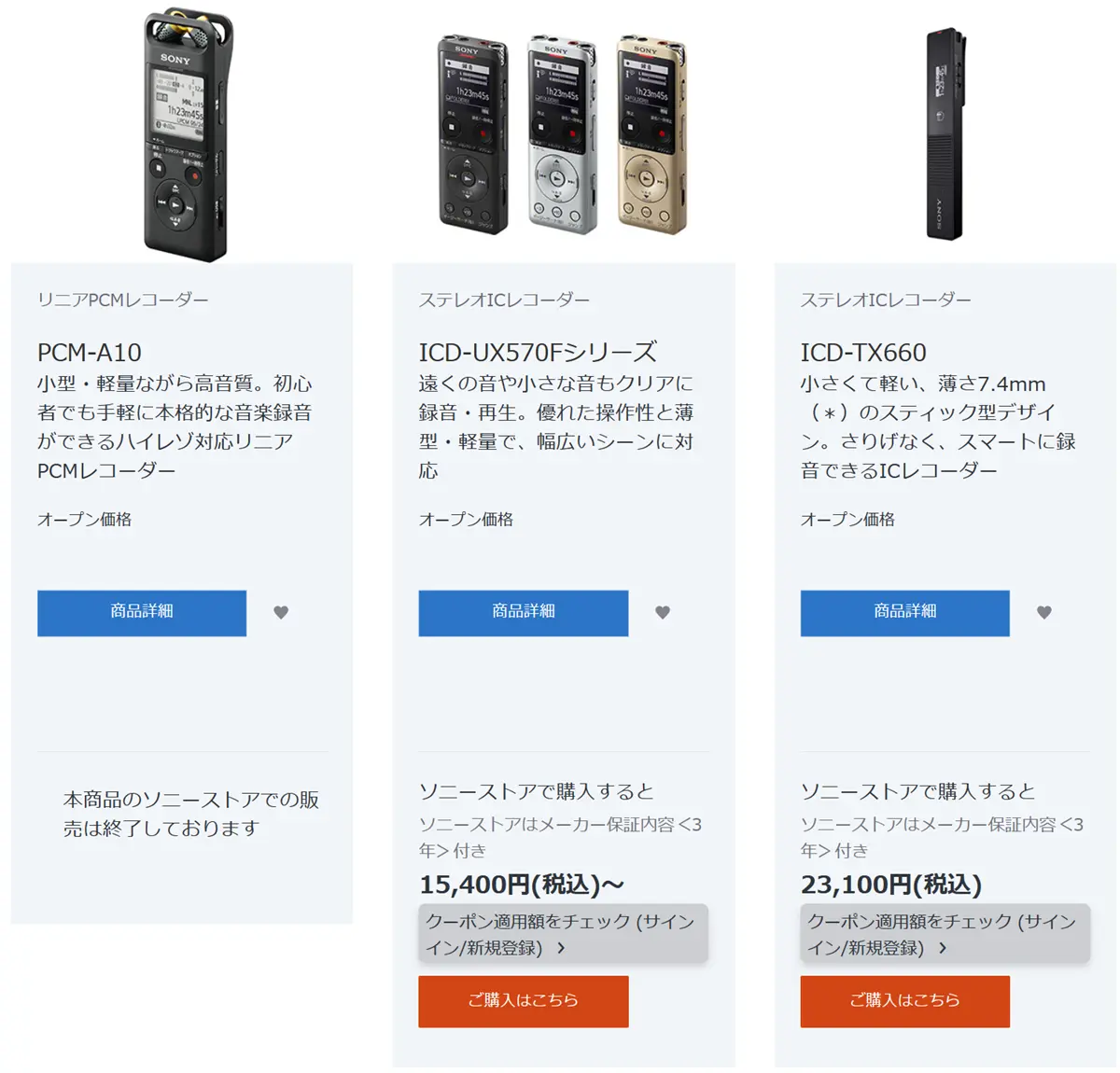 また、高音質で、音楽録音用途にも使える「リニアPCMレコーダー PCM-A10」もすでに販売終了となっている。