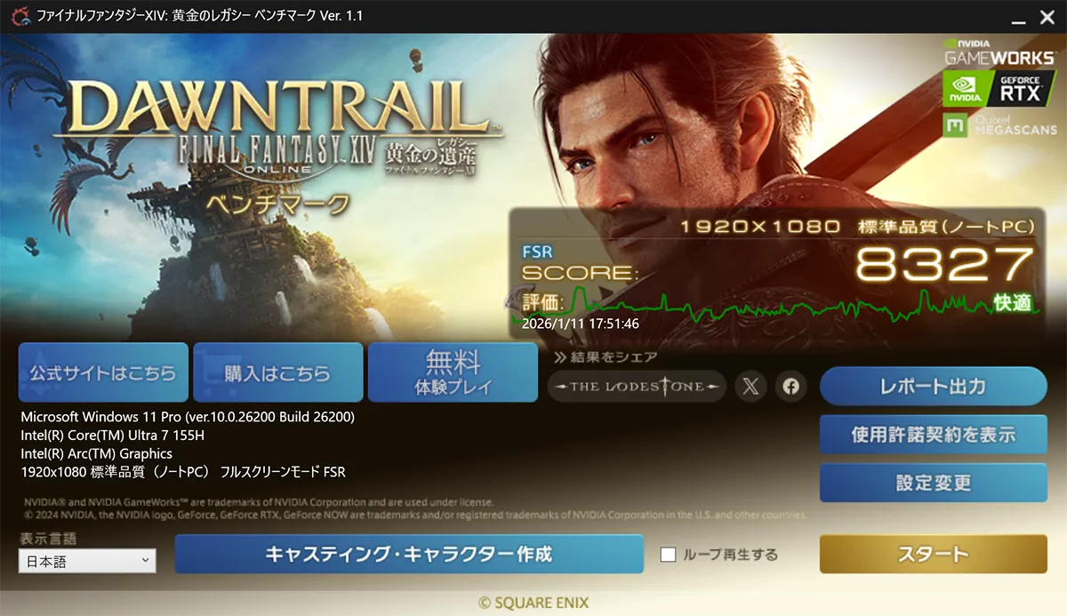 続いて、お決まりのFF14ベンチマークによる、グラフィック性能チェック。