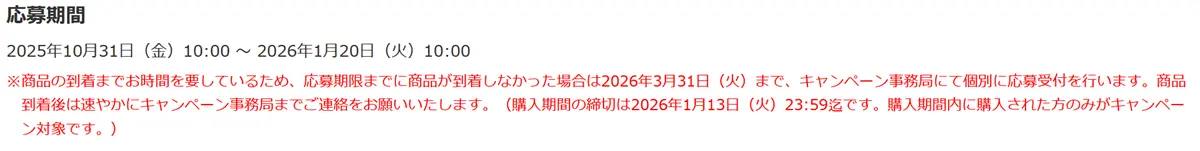 最後まで品薄が続いたままだったが。このキャンペーンの応募期間が、従来の1月20日(火)10時から、3月31日(火)まで延長された。ただし、「応募期限までに商品が到着しなかった場合」に限るようだ。