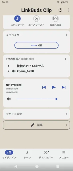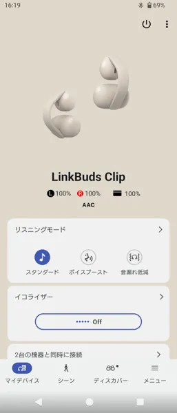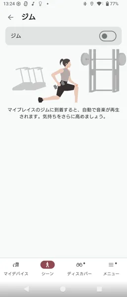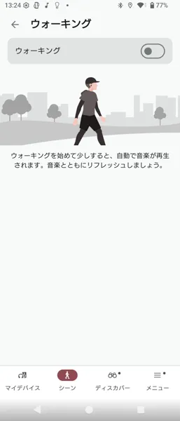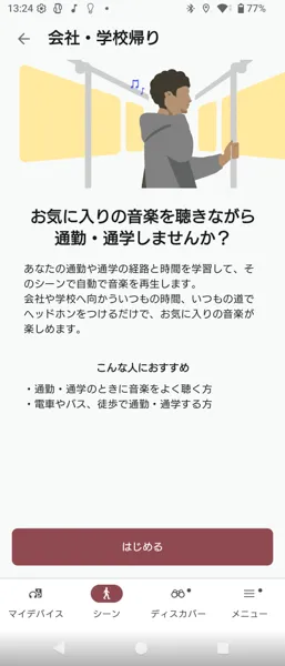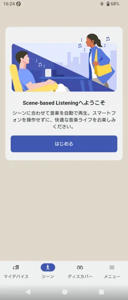 ↑「Scene-based Listening」で、シーンにあわせて、ヘッドホンの設定を最適化するアダプティブサウンドコントロールや、自動再生される音楽を楽しめる。