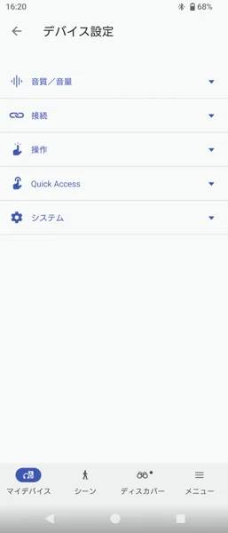 ホーム画面に表示される、リスニングモードやイコライザーなども、その本体は「デバイス設定」内に含まれていて、ショートカットとして表示させている。ホーム画面に表示するショートカットは、自由に選択可能。