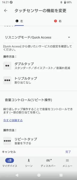 切り替えは、アプリだけでなく、デフォルトの割り当てのままなら、左イヤホンをダブルタップでも可能。切り替わり時に、音声でモードを案内してくれるからわかりやすい。