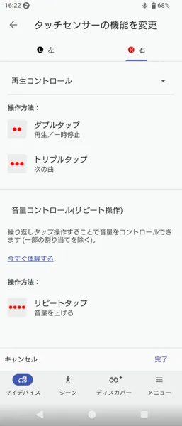 左右イヤホンそれぞれに、タップで操作できるが、デフォルトのままでも十分使えるし、そのタップ操作も、アプリなしでも使える。アプリを使うと、タップ操作の割り当てをカスタマイズできる。