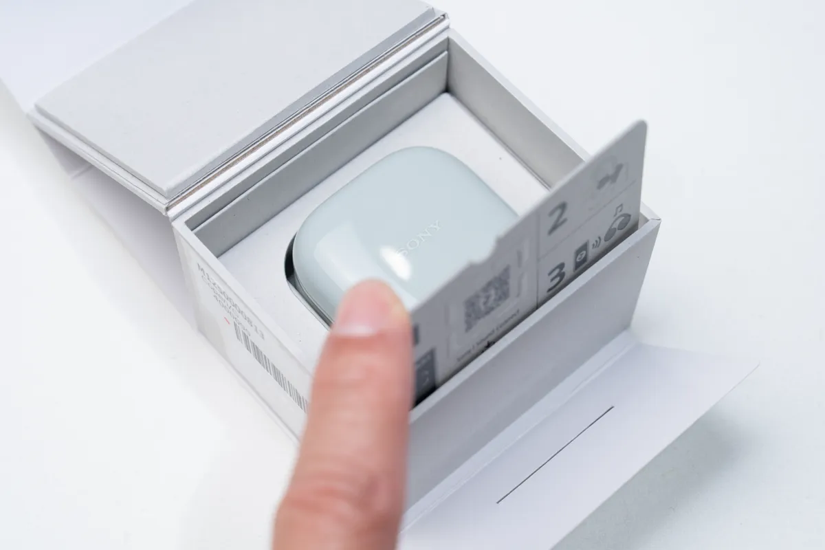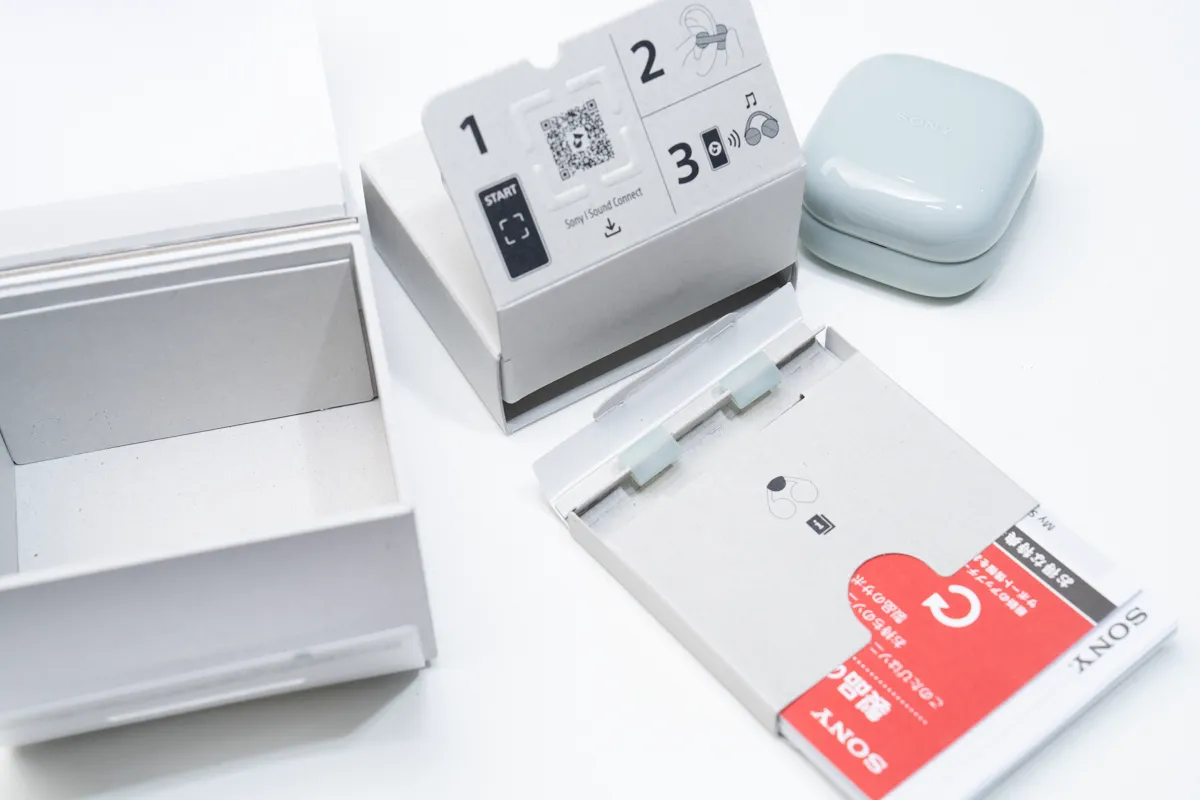 ↑一式。内ぶたには「Sony|Sound Connect」インストール用QRコード、「引き出し」に紙モノと、後述の「フィッティングクッション」