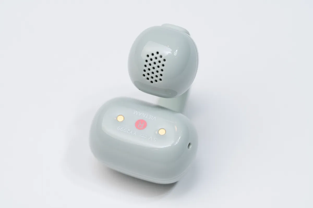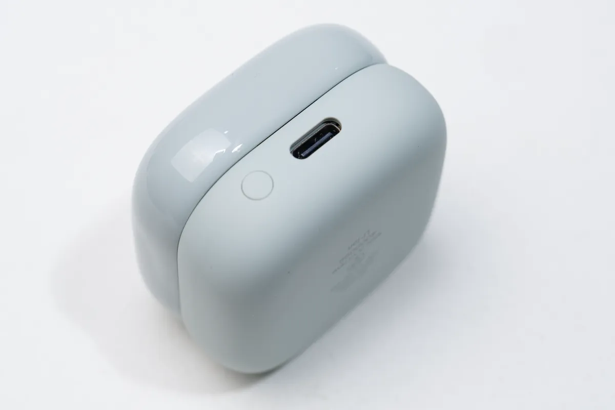 ↑ケース背面に、充電専用USB-C端子と、長押し操作する、Bluetoothペアリングボタン。
