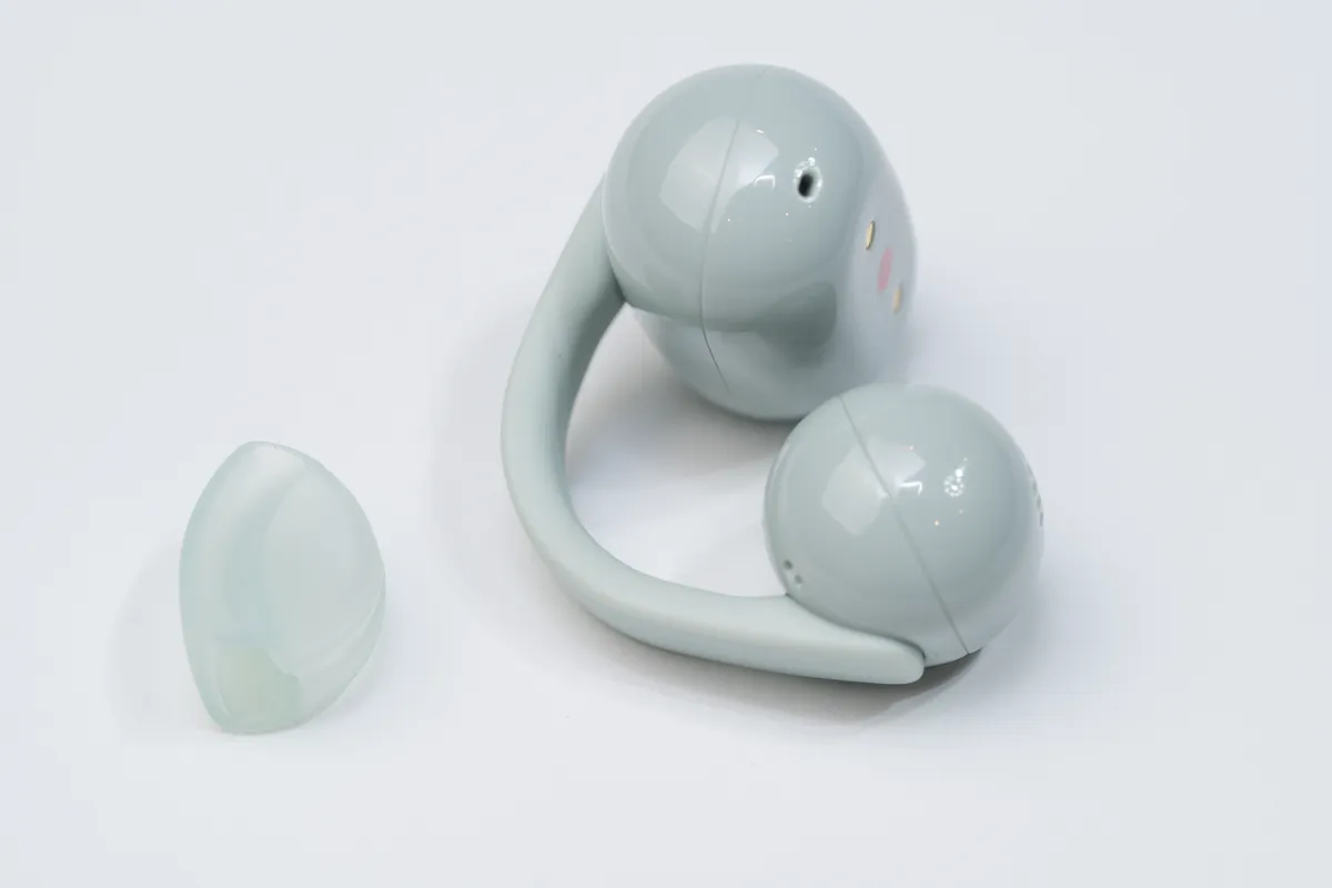 ↑丸と四角をつなぐパーツは、弾力があり、優しく耳をはさむ。