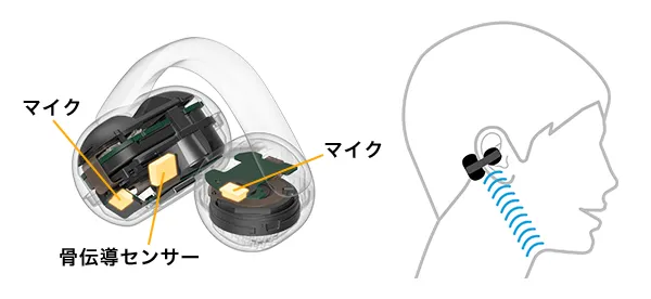 マイクはなにげに2つも搭載されており、丸、四角それぞれに。また、四角には、「骨伝導センサー」が仕込まれており、周囲の音を拾わず、自分の声の振動のみを拾うため、通話中の外音を抑えてくれる。
