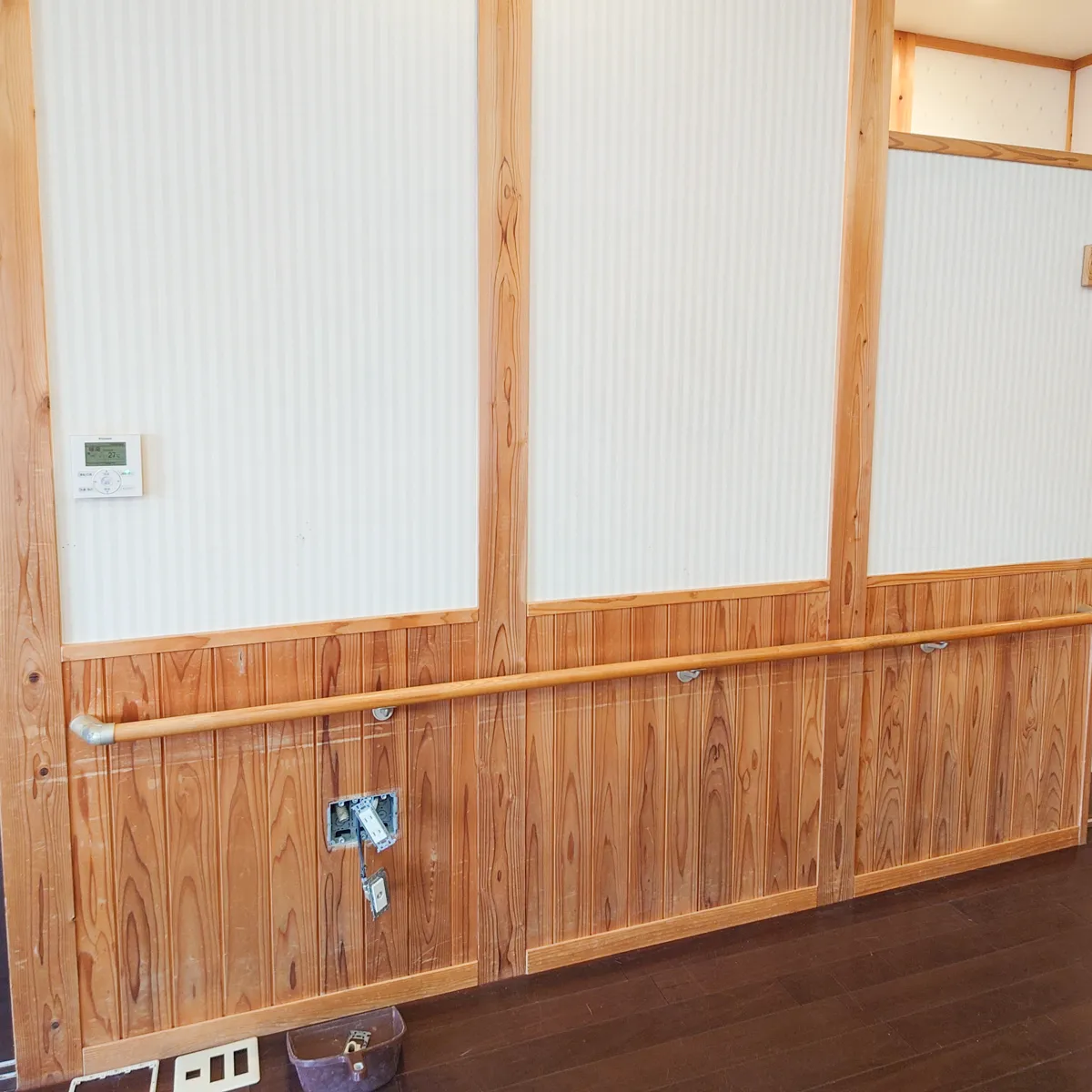 ちょうど真下に、それらが納まっているじゃないか!気になるのは、木製の腰壁。コンセントプレートを外して中をのぞいてみたら、やはり、この腰壁は、見た目用。なので、壁内は、上方までつながっているので、隠蔽配線は問題なし。