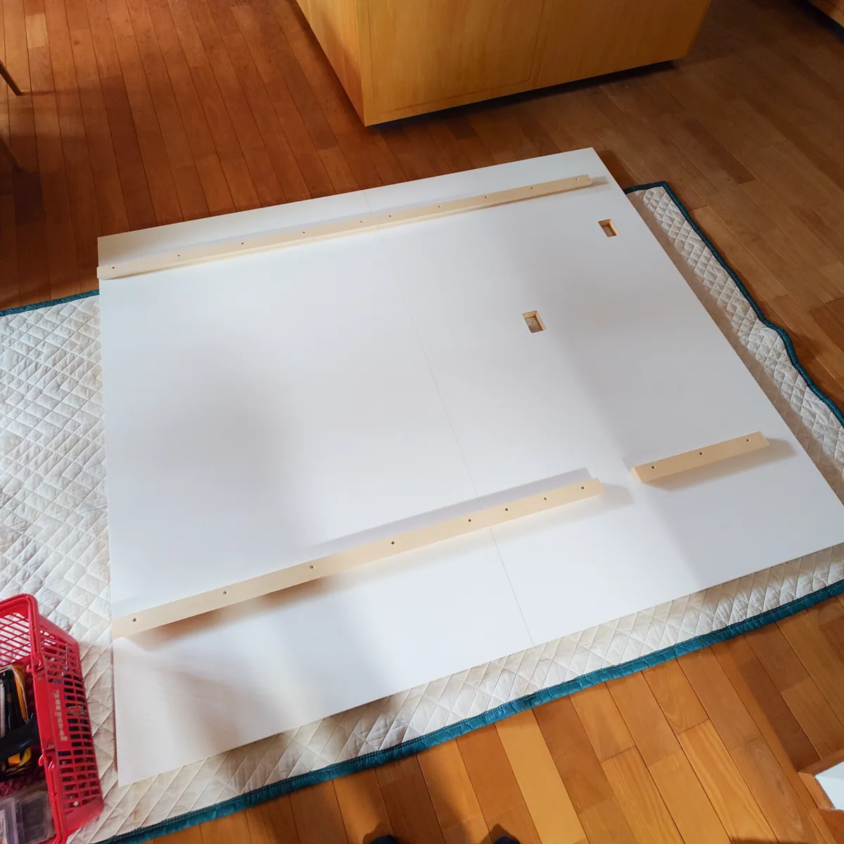 ↑特注壁を製作し、現地で微調整して、取り付ける。移植用の照明スイッチ取り付け穴や、テレビ用コンセントプレート穴も計算して配置。