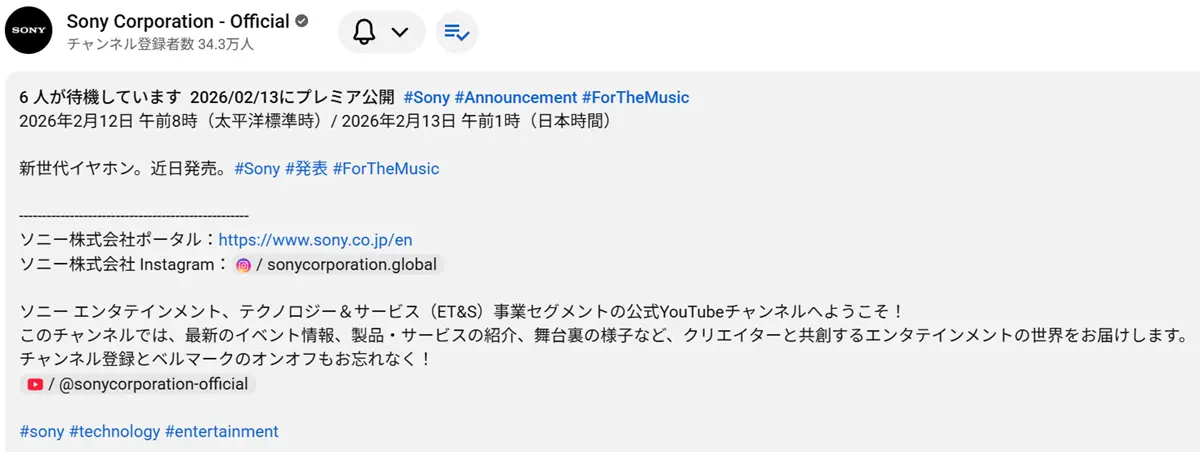 直近では、LinkBuds Clipのときには、Youtube「Sony Corporation – Official」にて、プレミア公開が設定されていたが、9時10分現在では、見当たらない。
