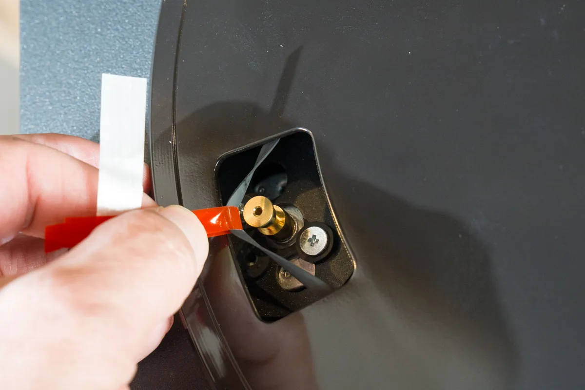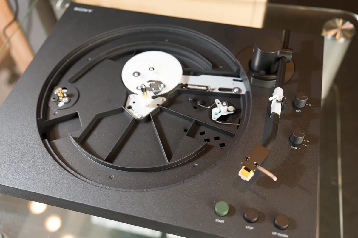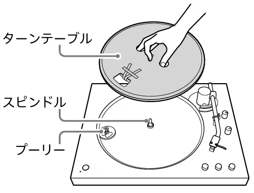 ↑ターンテーブルに元々はめられ、赤いテープで固定されている「ドライブベルト」を、プーリーに引っ掛ける。そう、「PS-LX5BT」は、「ベルトドライブ方式」なのだ。モーターの回転をこのベルトを通してターンテーブルを回す。一方、「スピンドル」にモーターが直結されていて、ベルトなしの「ダイレクトドライブ方式」という方式もある。