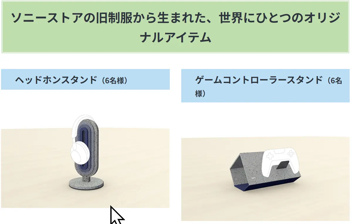 回収した生地を再利用して生まれるのは、「ヘッドホンスタンド」「ゲームコントローラースタンド」。制作数はそれぞれ6点ずつに限定し、ひとつひとつにソニーのロゴとナンバリングを施した、世界にひとつだけの特別な記念品です。
