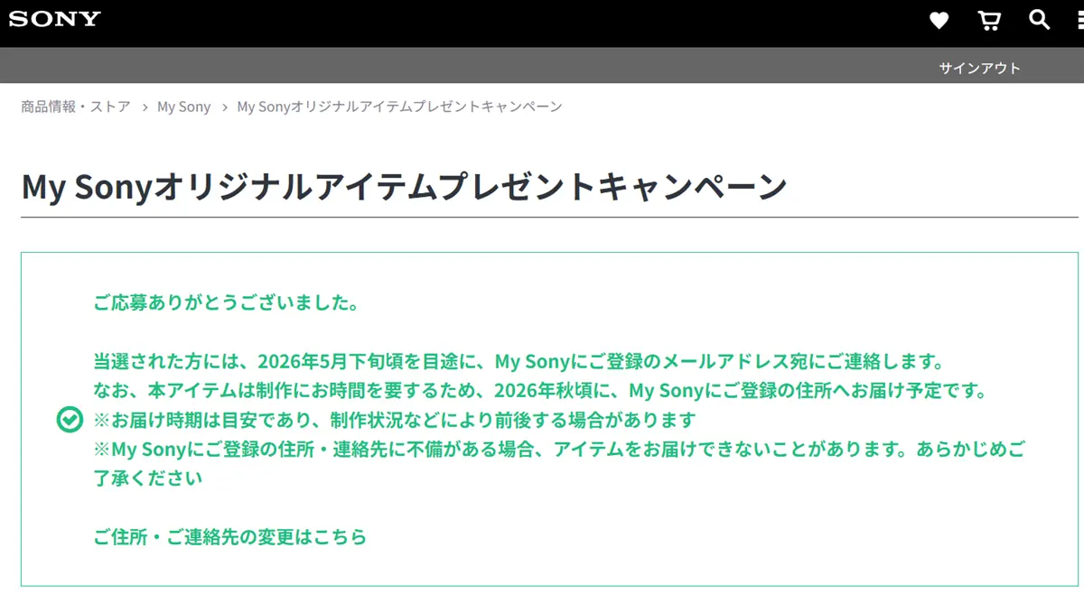 当選発表は、2026年5月下旬頃を目途に、My Sony登録のメールアドレスへ。