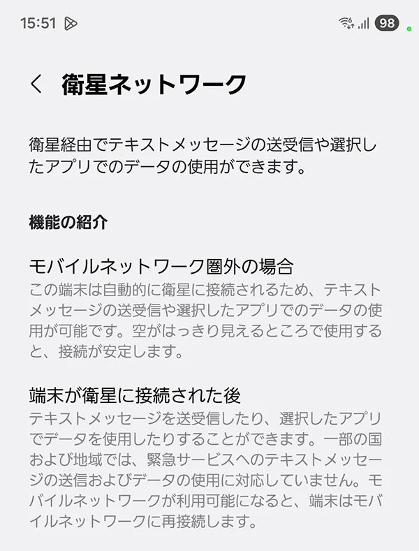 「設定」→「ネットワークとインターネット」→「SIM」→「NTT DOCOMO」→「衛星接続」