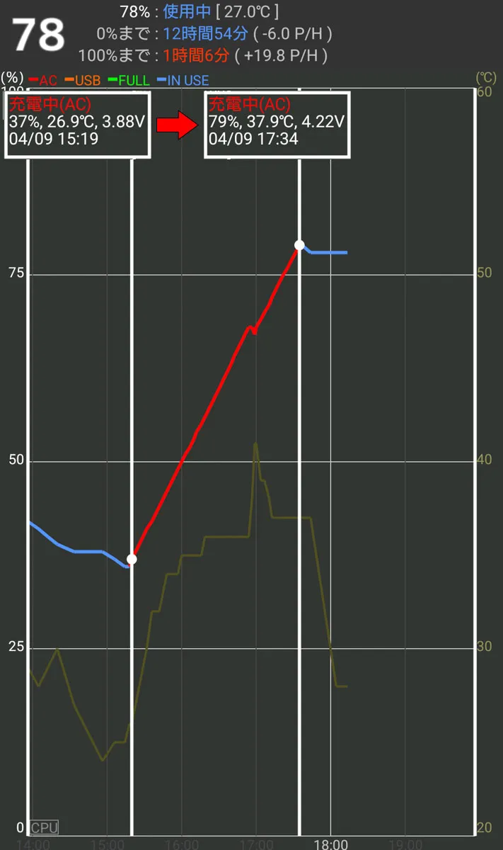 USB-C充電では、5,000mAhバッテリー搭載スマホを、58分かけて、64ポイント分だけ、充電可能