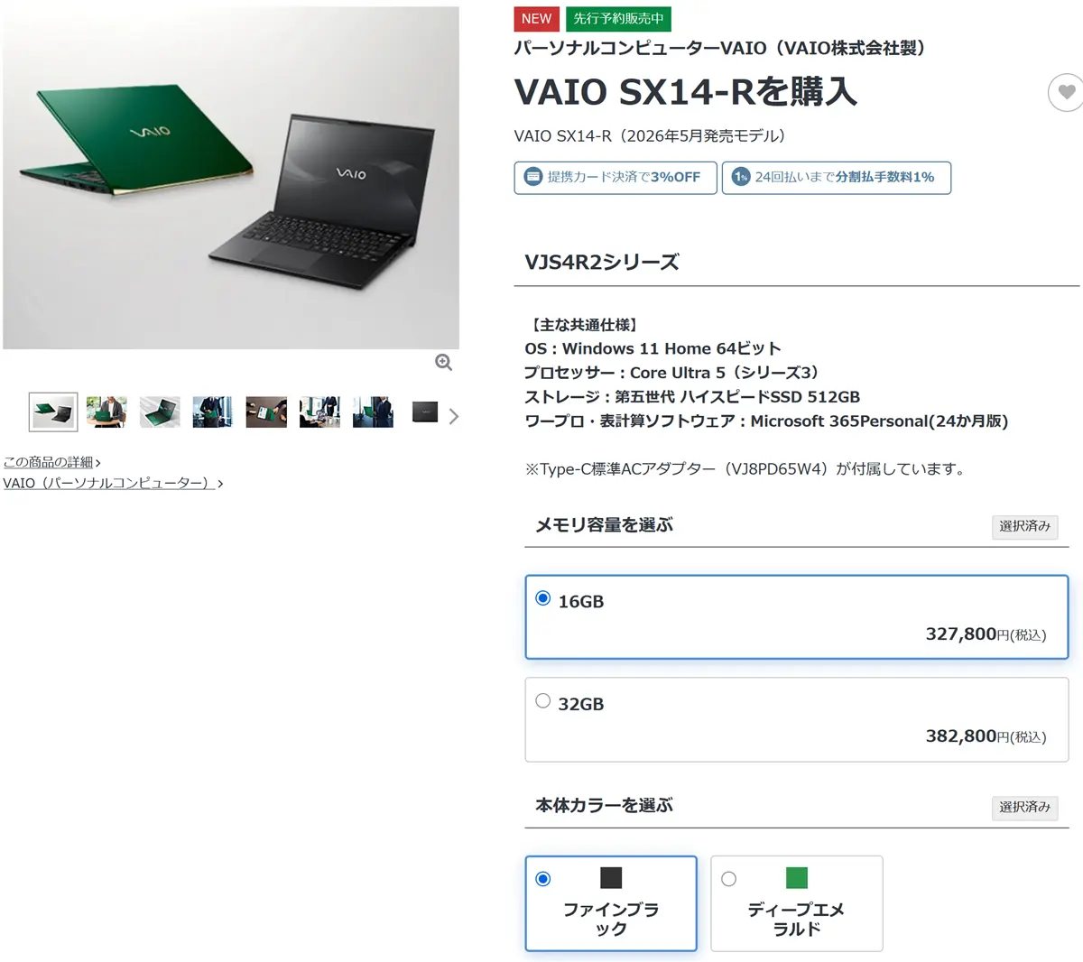 | New VAIO SX14-R | 16GB | 327,800円 |