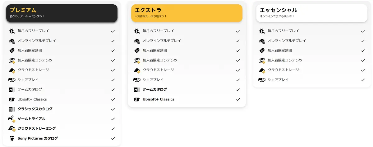 「PlayStation Plus」は、3つのコースが用意されいて、それぞれのサービスは↑のとおり。